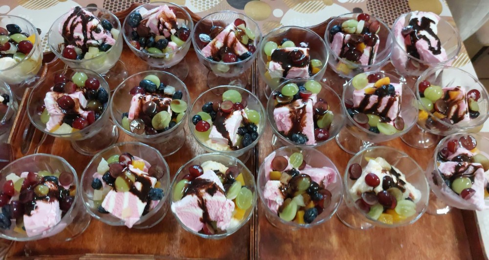 Podczas spotkania na stołach królowały udka z piekarnika w towarzystwie młodych ziemniaków oraz surówki, desery lodowe oraz bogaty wybór zimnych przystawek.